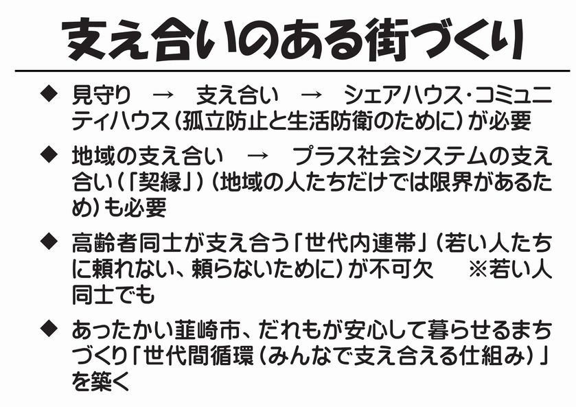 支え合いのる街づくり ◆見守り→支え合い→シェアハウス・コミュニテイハウス(孤立防止と生活防衛のために)が必要 ◆地域の支え合い→プラス社会システムの支え合い(「契縁」)(地域の人たちだけでは限界があるため)も必要 ◆高齢者同士が支え合う「世代内連帯」(若い人たちに頼れない、頼らないために)が不可欠 ※若い人同士でも ◆あったかい韮崎市だれもが安心して暮らせるまちづくり「世代間循環(みんなで支え合える仕組み)」を築く