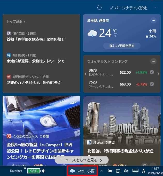 6月5日、Windows 10のタスクバーの「通知領域」の左側に、突然、「天気と温度